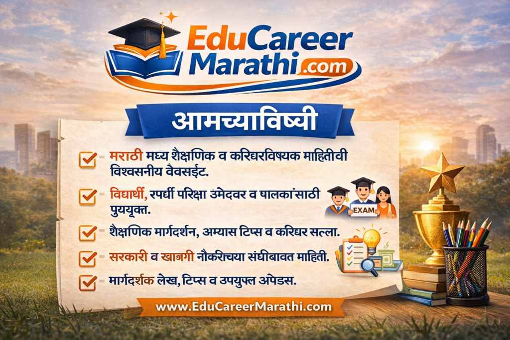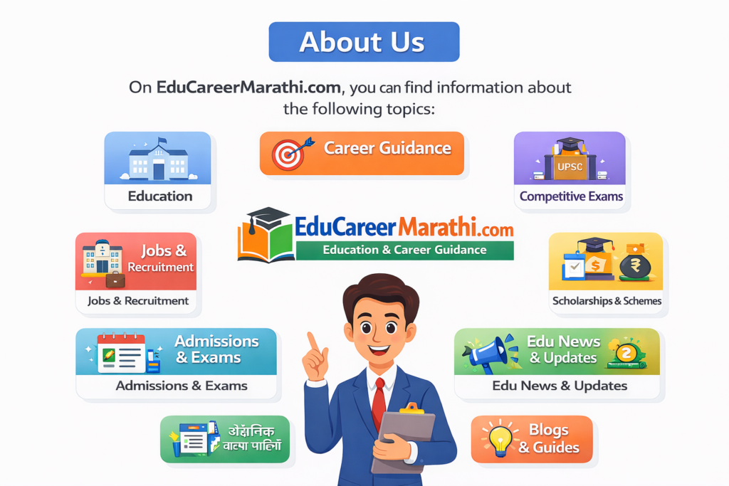 “EduCareerMarathi.com या ब्लॉगच्या माध्यमातून आपल्याला खालील विषयांवरील सविस्तर माहिती मिळेल.”
