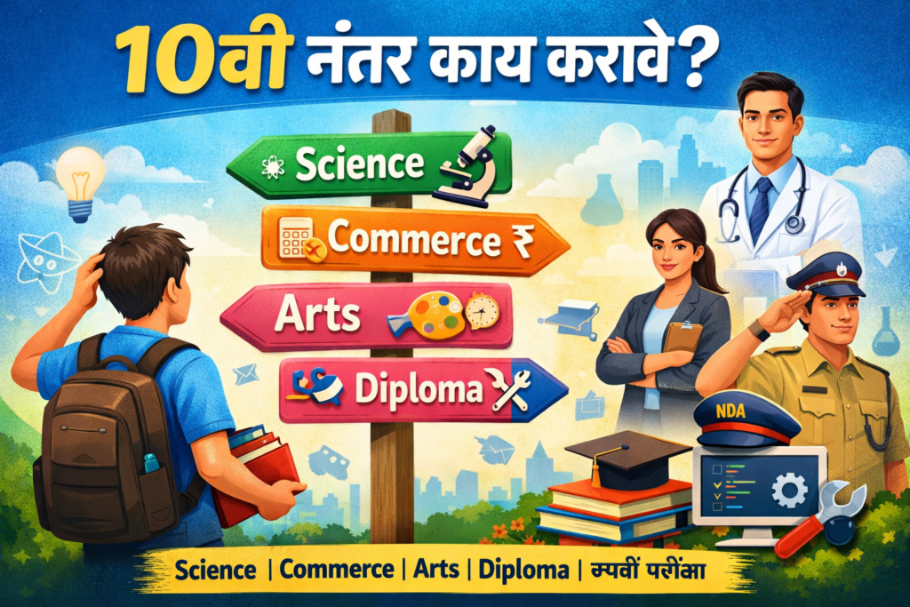हा निर्णय खूप महत्त्वाचा असतो कारण याच निर्णयावर पुढील शिक्षण, नोकरी आणि आयुष्याची दिशा ठरते. योग्य माहिती नसल्यामुळे अनेक विद्यार्थी गोंधळात पडतात. म्हणूनच या लेखामध्ये 10वी नंतरचे सर्व प्रमुख करिअर पर्याय सोप्या मराठीत समजावून सांगितले आहेत.